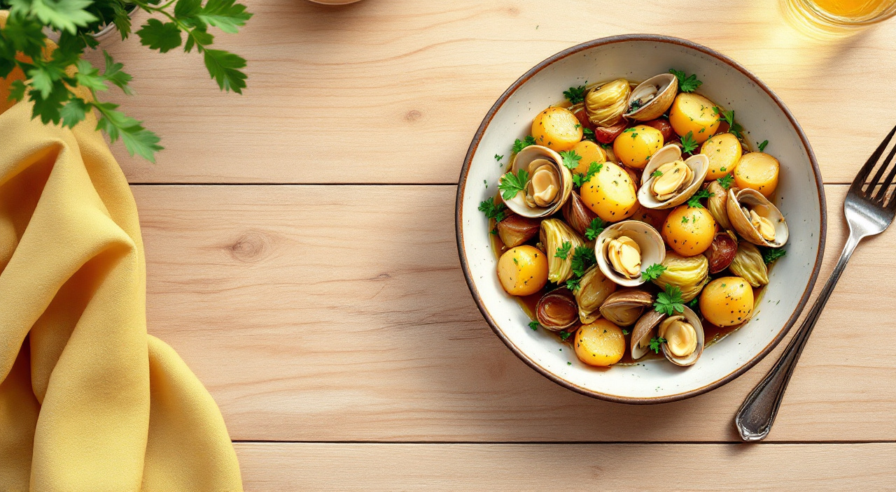 Y por último, echamos la Esencia de Ajo y Perejil de Gallina Blanca en una cazuela con un chorrito de aceite, y se agregan las almejas y se cocina hasta que se abran. Después se incorporan todo a la cacerola de las alcachofas y se sirve en plato hondo.