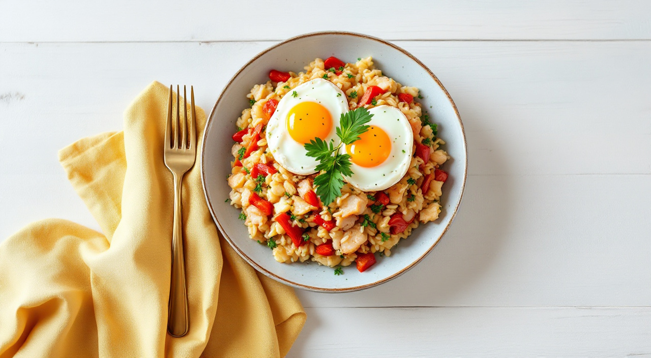 Calentar el caldo vegetal GALLINA BLANCA con abundante perejil picado y agregarlo al arroz, de tal forma que cueza a fuego vivo; cuando comience a consumirse (pasados 10 minutos aproximadamente), bajar el fuego para que termine de hacerse lentamente (unos 5 minutos más). Encender el horno a 200°. Entonces batir los huevos y volcarlos sobre el arroz (comprobando el punto de sal y añadiendo más si fuera necesario); meter el arroz en el horno y dejar secar entre 2 y 5 minutos), tapando la cazuela.