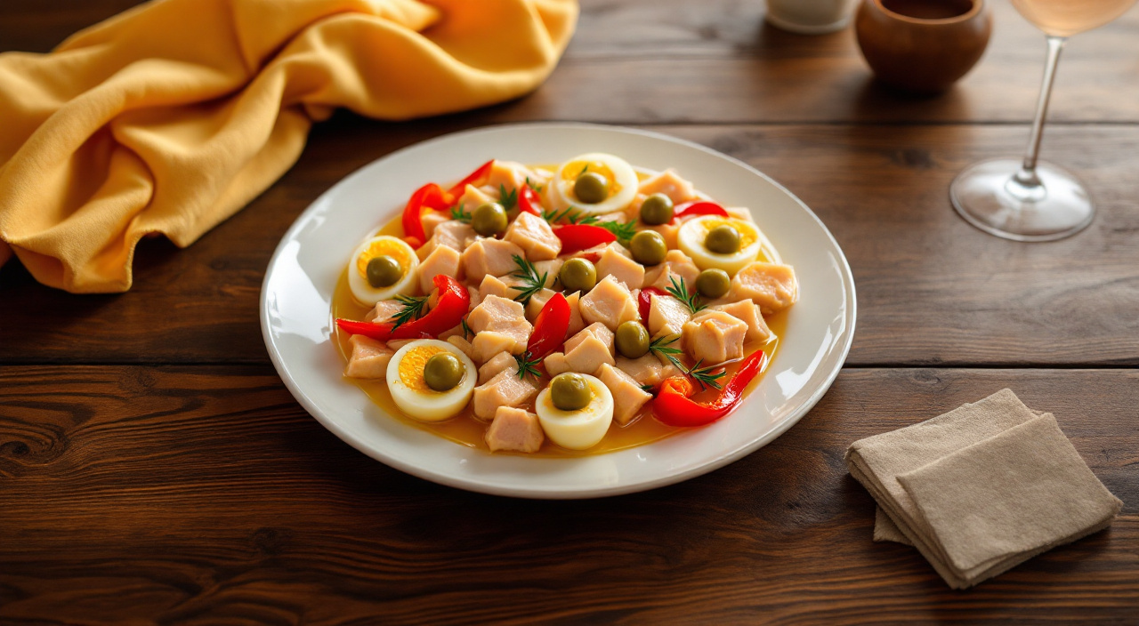 Remoja las hojas de gelatina y disuélvelas después en el Caldo de Pescado Gallina Blanca. Vierte parte de la gelatina aún caliente en un molde y decóralo con las aceitunas cortadas a rodajas. Deja enfriar.