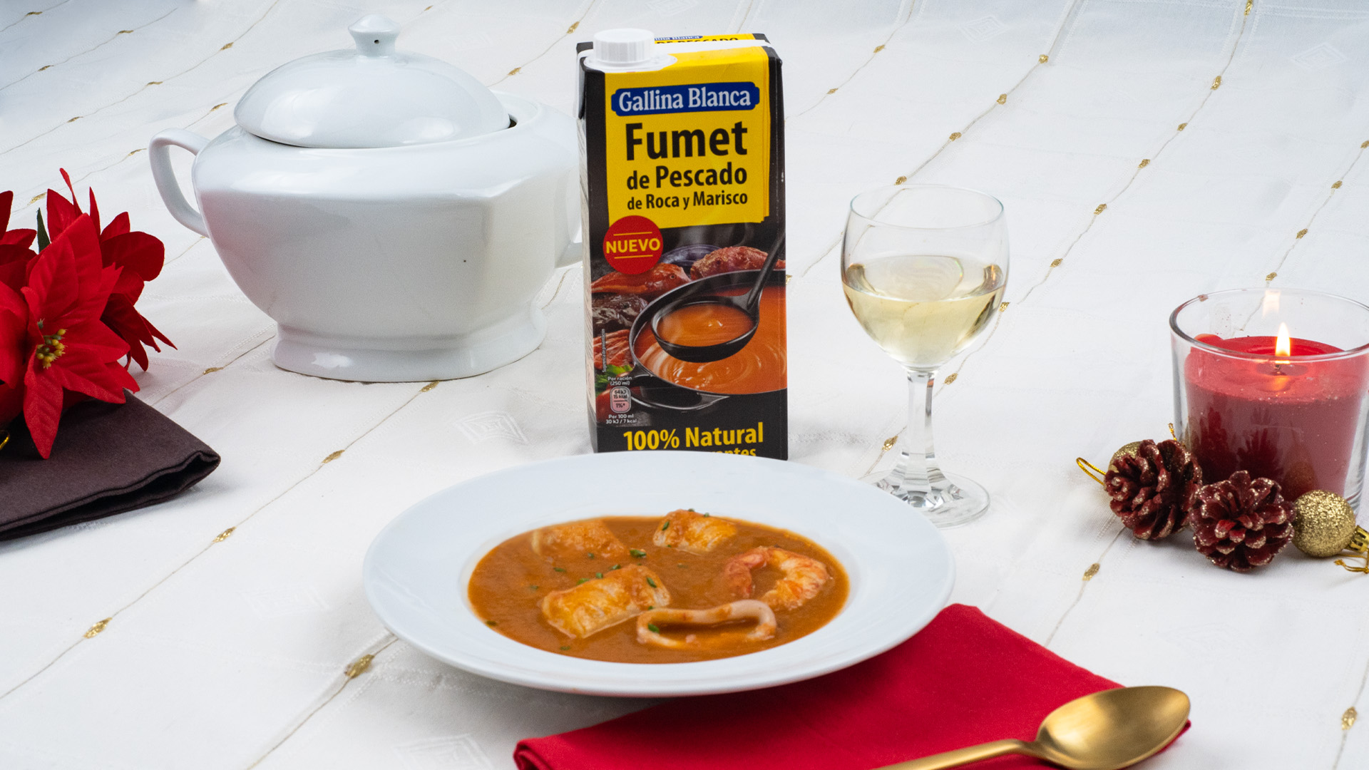 Es el momento de añadir el Fumet de Pescado de Roca y Marisco 100% Natural Gallina Blanca para que la mejor receta de caldereta de pescado y marisco quede buenísima. Cocina unos 5 minutos y después suma el bacalao enharinado. Cocina 2 minutos y entonces añade el marisco: las gambas y el bogavante. Lo colocas en la cazuela y acabas la cocción con un poco de perejil picado. Es una receta que ya lo decíamos antes: es irresistible. ¿Ves que cocinar caldereta de pescado y marisco es muy fácil? ¡Ahora a disfrutarla!