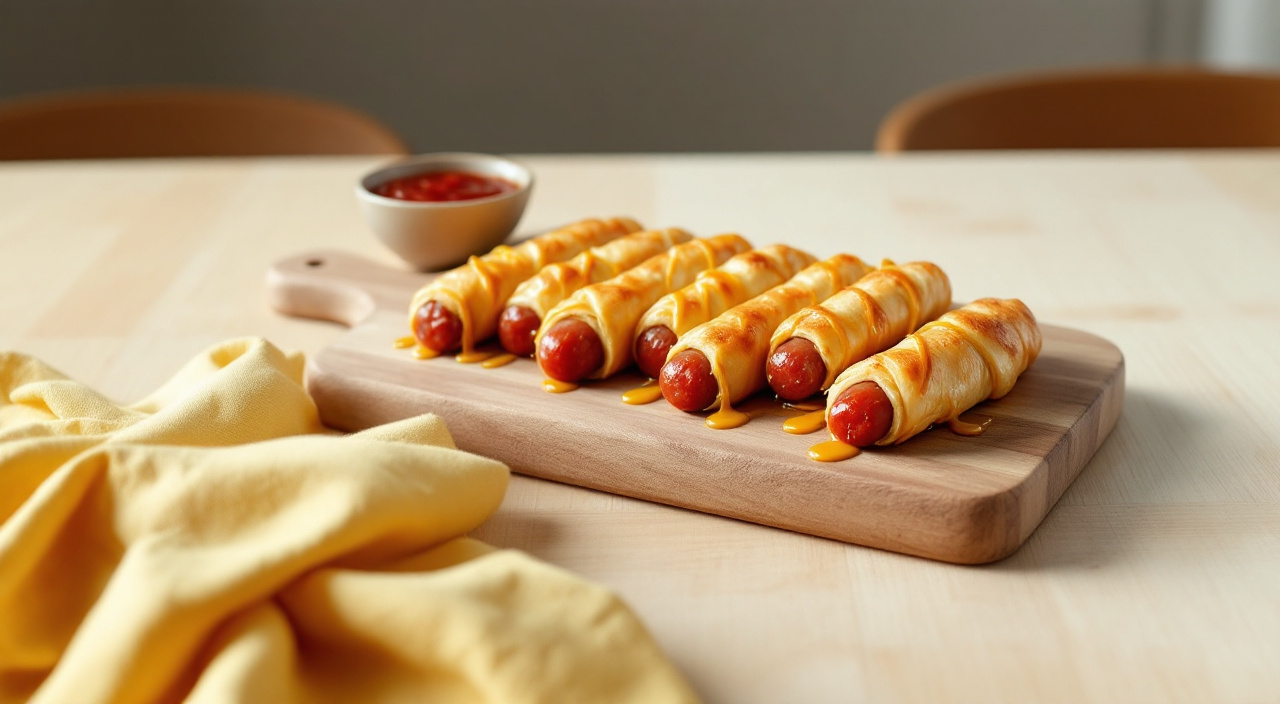 Salpicar la mesa de harina y extender el hojaldre, cortar 16 tiras (la mitad de lo que miden las 1/2 salchichas y el doble de la circunferencia, para poder enrollarlas).