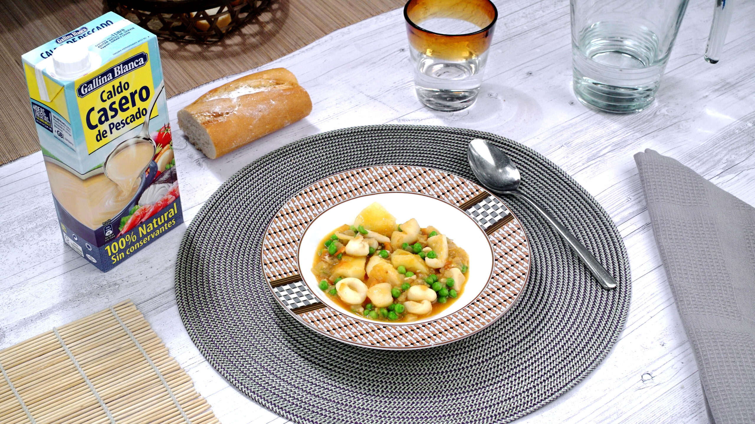 Cuando esté todo bien ligadito, vertemos gentilmente (nos encanta esta expresión tan británica) el medio litro de Caldo Casero de Pescado 100% Natural e incorporamos las patatas peladas y cascadas (más abajo te explicamos lo que es “cascar” una patata, por si te ha sonado a chino). Llevamos todo a ebullición. Una vez rompa a hervir, bajamos el fuego a suave y, sin tapar, dejamos cocinar durante 10 minutos más para que el agua del caldo se evapore más rápidamente y obtengamos así una consistencia mucho más interesante. Finalmente añadimos los guisantes y cocemos 5 minutos más. Apagamos el fuego, dejamos reposar un par de minutos y servimos caliente este lujazo de plato procedente del mar y de la huerta. ¡A disfrutar de este increíble plato, que te lo has ganado!