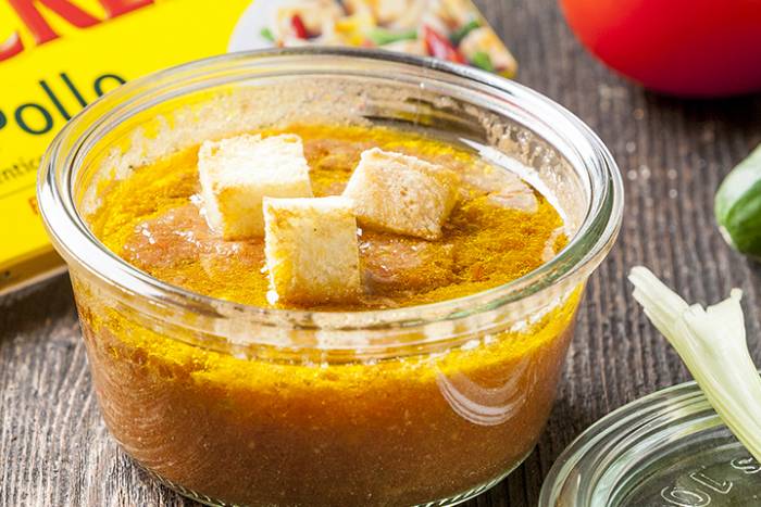 Los ingredientes del gazpacho andaluz no tienen ningún secreto: tomates maduros, pimiento verde, pepino, ajo, pan y aceite de oliva virgen extra. Además, nosotros te proponemos darle un toque extra de sabor a esta receta de gazpacho andaluz añadiéndole una pastilla de Avecrem Caldo de Pollo