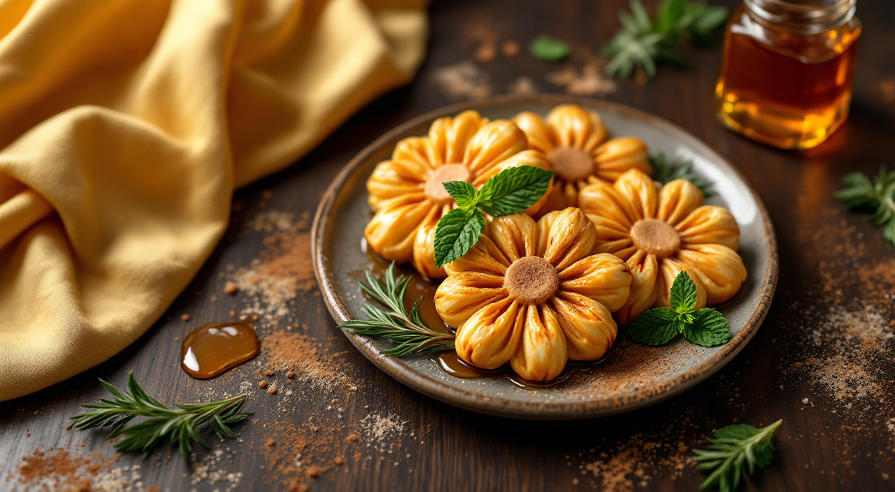 Mezcla los huevos con dos cucharadas de aceite de girasol y con el anís. Bátelos e incorpora la harina despacio, hasta obtener una masa parecida a la del pan. Trabaja la masa durante 5 min., forma bolitas del tamaño de una nuez y aplástalas con un rodillo. Para formar las hojuelas, pon un palo de madera en el centro del disco y hazlo girar para que la masa de enrolle y forme una flor. Fríelas por tandas en abundante aceite caliente. Una vez fritas, escúrrelas y déjalas enfriar. Y para finalizar, báñalas con la miel y decóralas con las hojas de menta.