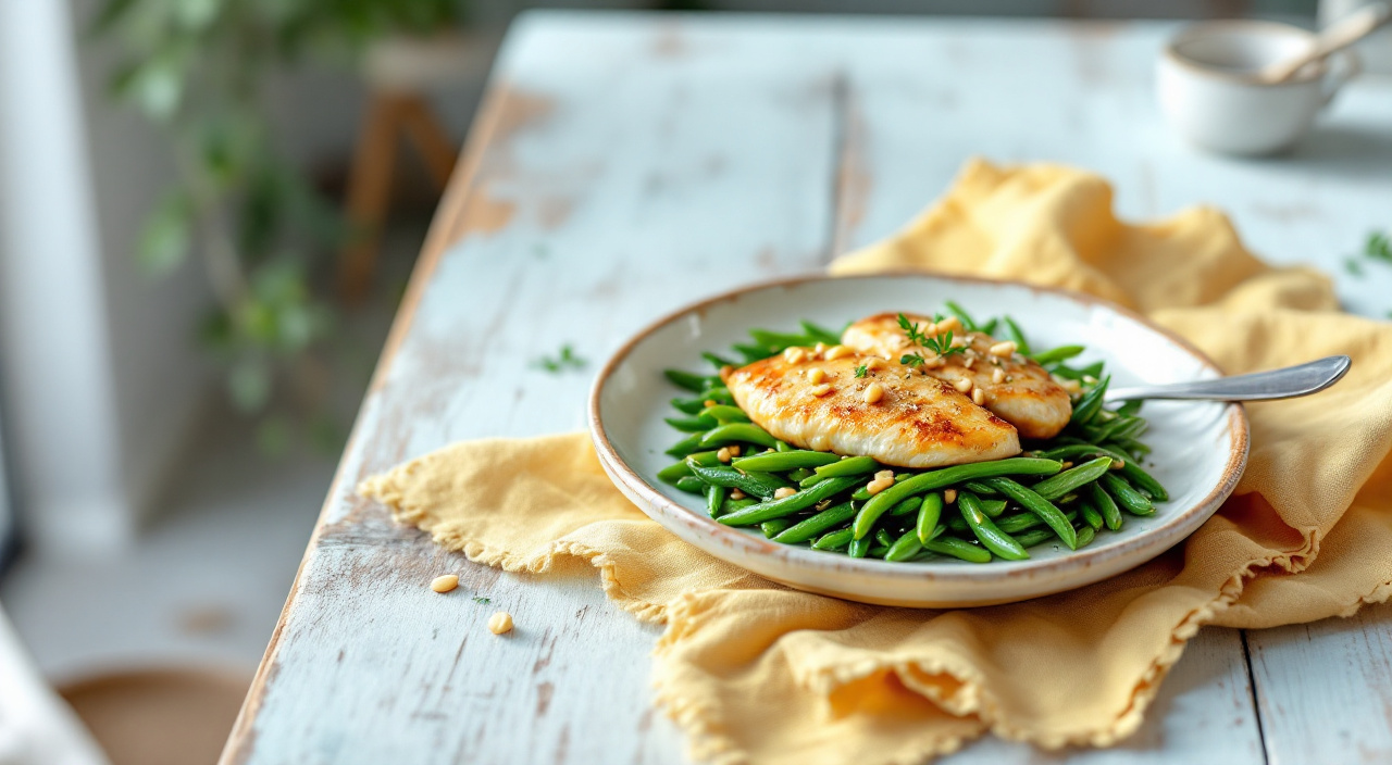 Mientras que se cuecen las judías, freir en una sarten las pechugas de pollo con unos ajos cortados en trocitos pequeños y los piñones.