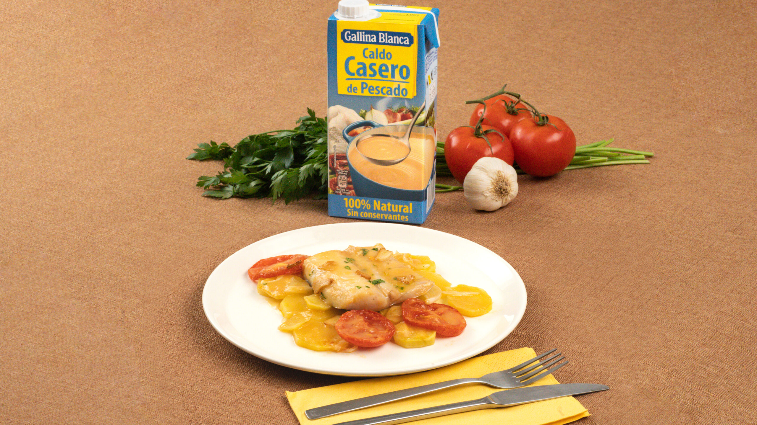 Con la bandeja lista, es momento de precalentar el horno a 200ºC y meterla durante unos 15 minutos. Es crucial que vigiles este tiempo, ya que el objetivo es que las patatas y las cebollas comiencen a ablandarse. Pasado este tiempo, saca la bandeja del horno y añade un poco de vino blanco sobre la mezcla; esto ayudará a que no se resequen los ingredientes y potenciará el sabor en la receta de merluza al horno. Luego, coloca con cuidado las rodajas de merluza sobre la base que ya preparaste y, para darle intensidad, vierte un poco de Caldo Casero de Pescado 100% Natural. Vuelve a introducir la bandeja en el horno.
