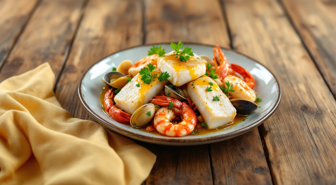 Freir en una cazuela el ajo picaddo un poco de harina, añadir el Avecrem Caldo de Pescado -30% de sal o sal a la merluza regar con vino y agua hasta cubrir por la mitad añadir los langostinos, carabineros, almejas y el peregil picado dejar hacer a fuego lento.