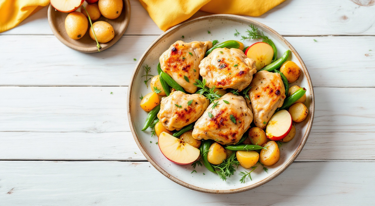 Sirve en una fuente las patatas, los muslos de pollo y las manzanas. Pasa la salsa resultante a una cazuela, dale un hervor y lígala con la harina de maíz refinada disuelta en agua. Añade un puñado de perejil picado y salsea todo.