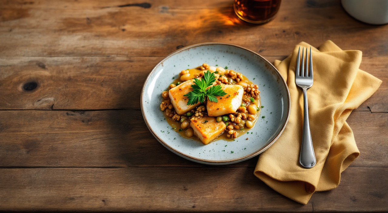 En una cazuela colocamos el rape, le añadimos medio vaso de agua, la media copa de vino blanco, el triturado de cebolla con el puerro, y las nueces. Se deja cocer 20 minutos