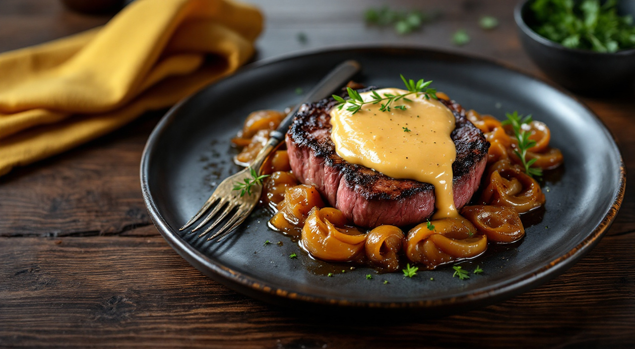 Lo servimos en el plato, y encima le ponemos la cebolla caramelizada.